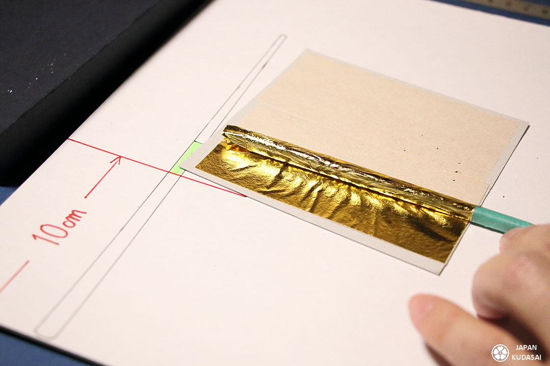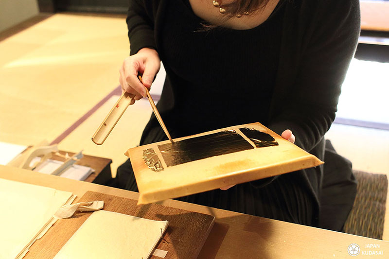 L’atelier se poursuit avec la confection des repose-baguettes. Les étapes sont similaires aux précédentes (sans poudre métallique cette fois-ci). J’ai choisi d’imprimer le sceau (« mon » en japonais) de la famille Maeda en guise de souvenir. Une fois encore, il fallait manipuler l’or avec beaucoup de concentration en contrôlant bien sa respiration pour éviter que la feuille ne se replie sur elle-même.