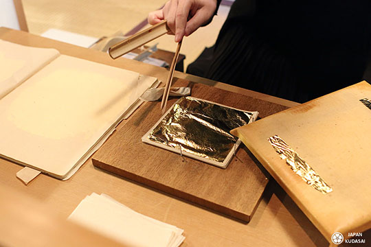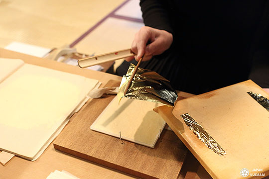 Traditionnellement utilisées pour la dorure des temples, statues, fusuma (panneaux coulissants), ou intégrées à des objets en laque, on trouve plusieurs ateliers qui ouvrent leurs portes aux touristes et proposent de s’initier aux techniques de dorure à la feuille d’or. A ma connaissance, on ne peut pas participer à ce type expérience ailleurs au Japon. J’ai donc sauté sur l’occasion en réservant une séance dans l’atelier Hakuza, implanté en plein cœur du quartier préservé Higashi chaya à l’Est de la ville.