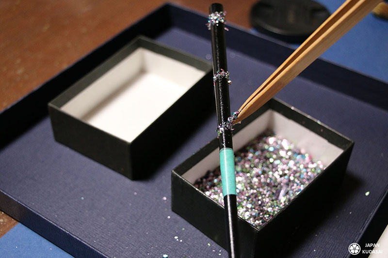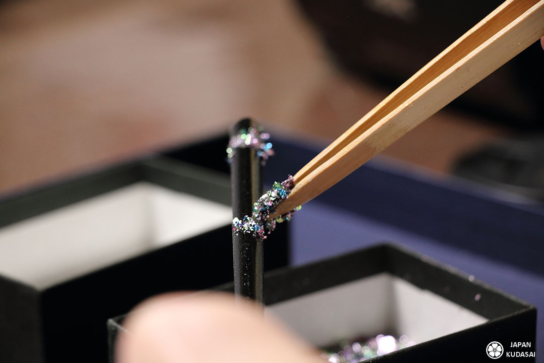 On passe alors délicatement un petit coup de brosse sur l’or pour le retirer par portion et révéler la poudre métallique. Les paillettes volaient autour de nous, c’était un très beau moment. Emballées dans un étui de protection bien pensé pour la valise, les baguettes seront utilisables après 2 semaines de séchage. Inutile de dire qu’elles ne peuvent pas être nettoyées au lave-vaisselle.